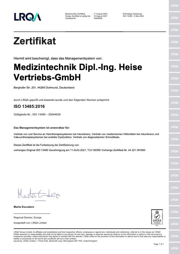 Medizintechnik Heise - Zertifikat gemäßEN ISO 13485:2016